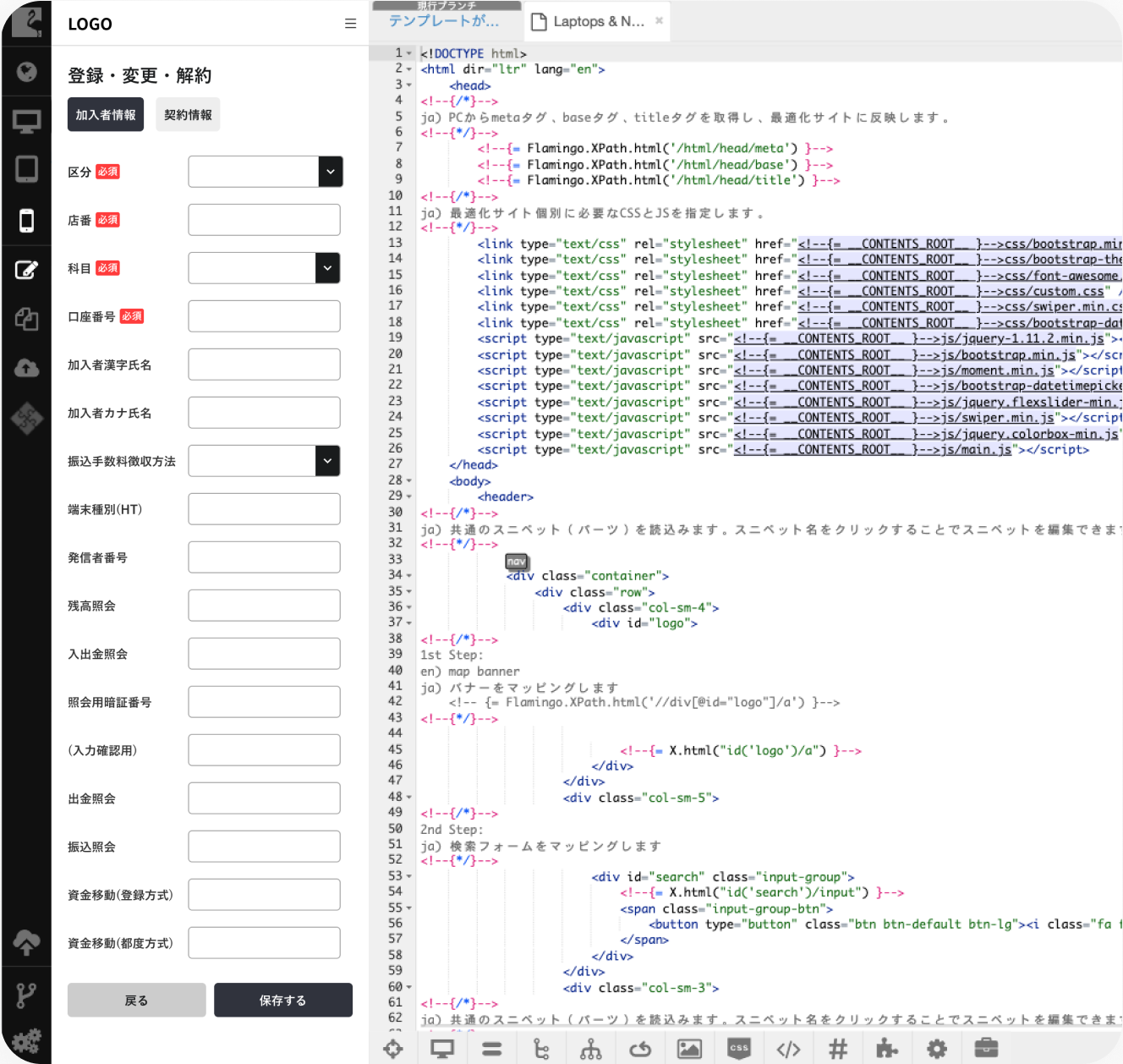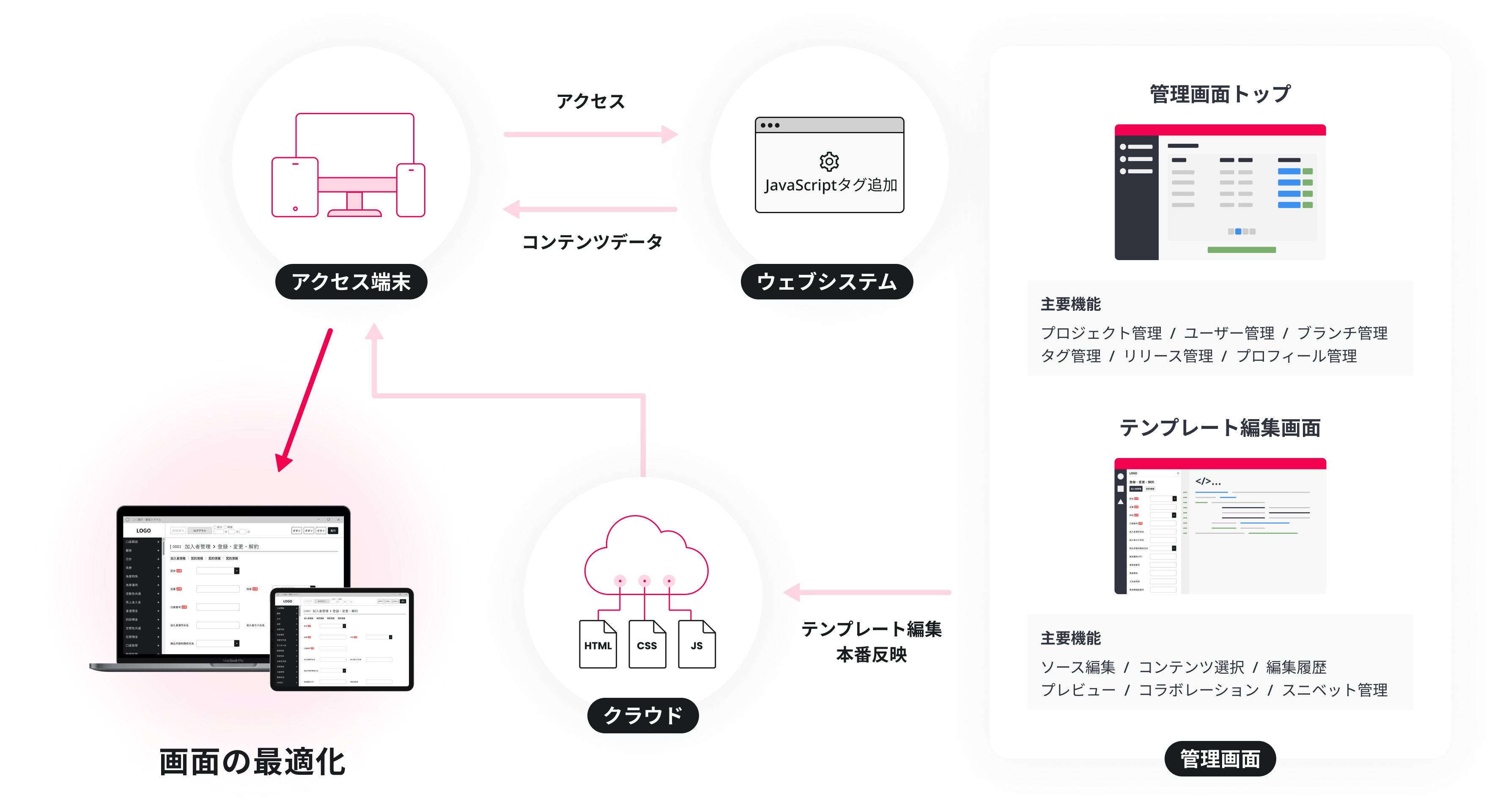 クラウドサーバから配信されるテンプレート(HTML)が反映され、