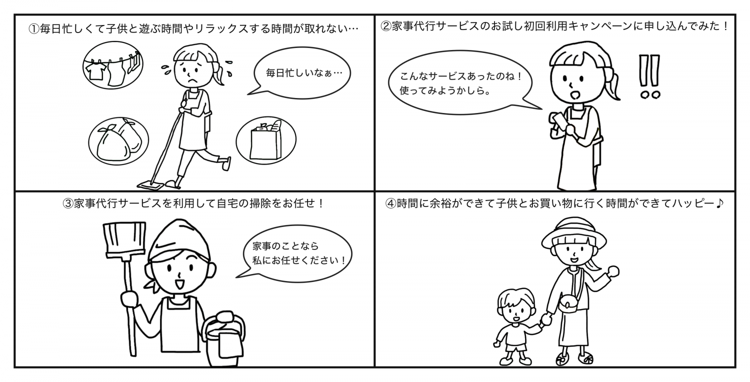 ストーリーボードはあくまでもアイデアを視覚化することで、ユーザーが感じる価値を分かりやすくする目的で作成されます。従って、重要なことは絵の巧拙ではなく、その商品・サービスがどのような問題解決をするのかという中身の部分です。