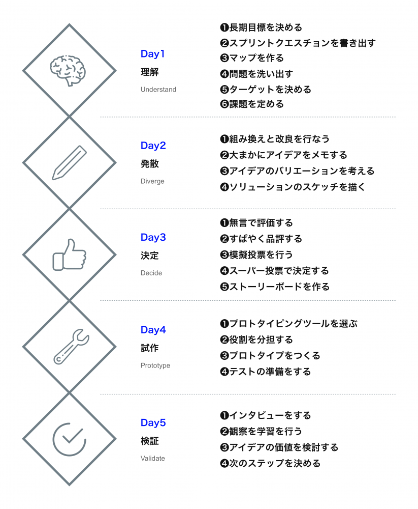 デザインスプリントの5日間のスケジュールは、下記の通りです。
